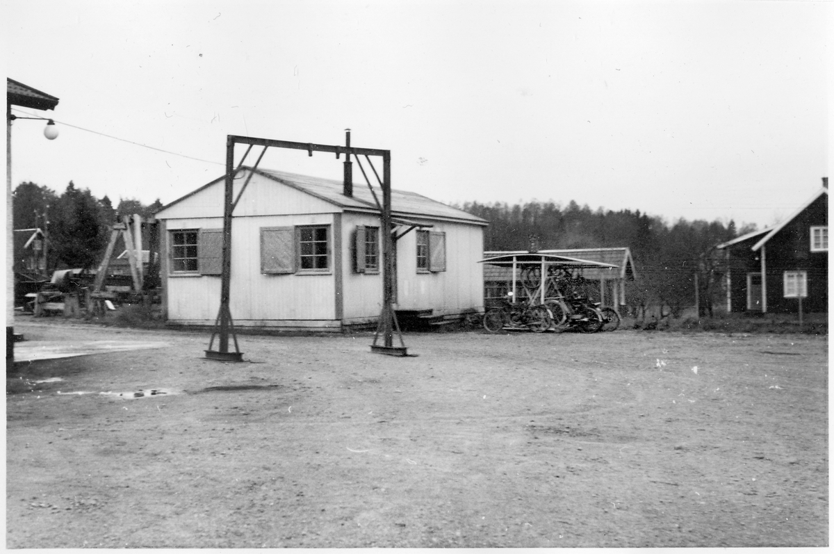 Vägstation P10, Torp. Garageplan med byggnad, eventuellt för manskapet, cykelställ med cyklar. Bostadshus i bakgrunden.