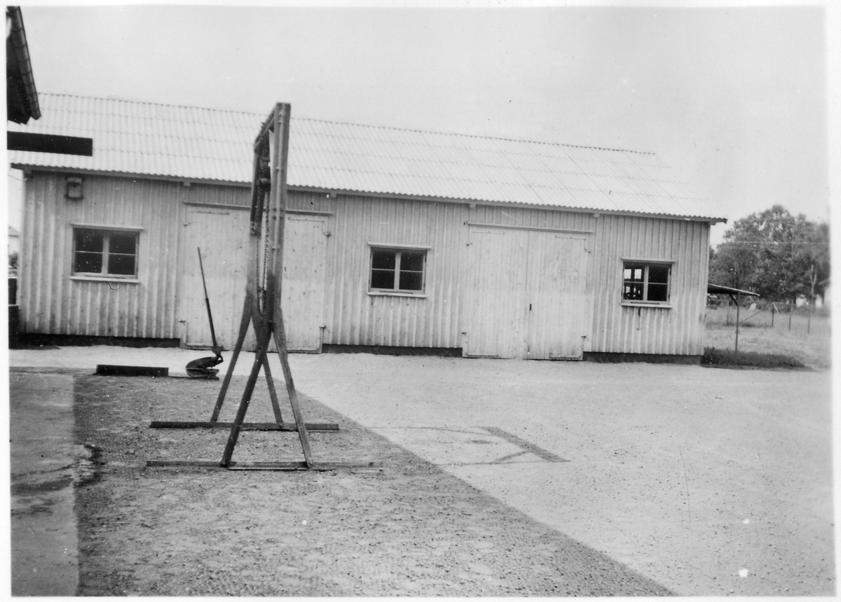 Vägstation P12, Åsaka. Förrådsbyggnad. Ställning med vinsch framför byggnaden. Bänkplåtsax stående på gården.