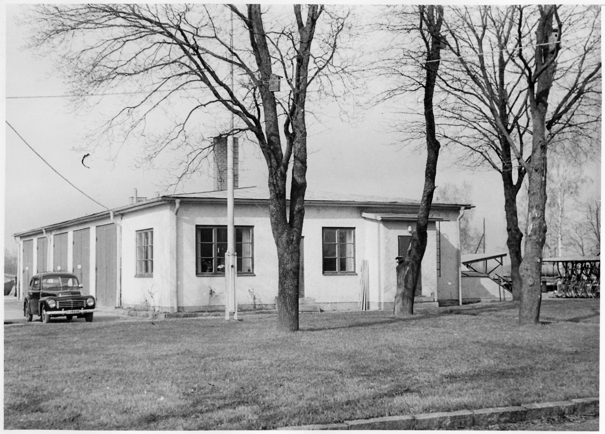 Vägstation T3, Hallsberg. Garage och kontorsbyggnad. Kontorsdelen i främre delen av byggnaden. Personbil Volvo PV, T19216, framför byggnaden. Cykelställ med cyklar, flaggstång.