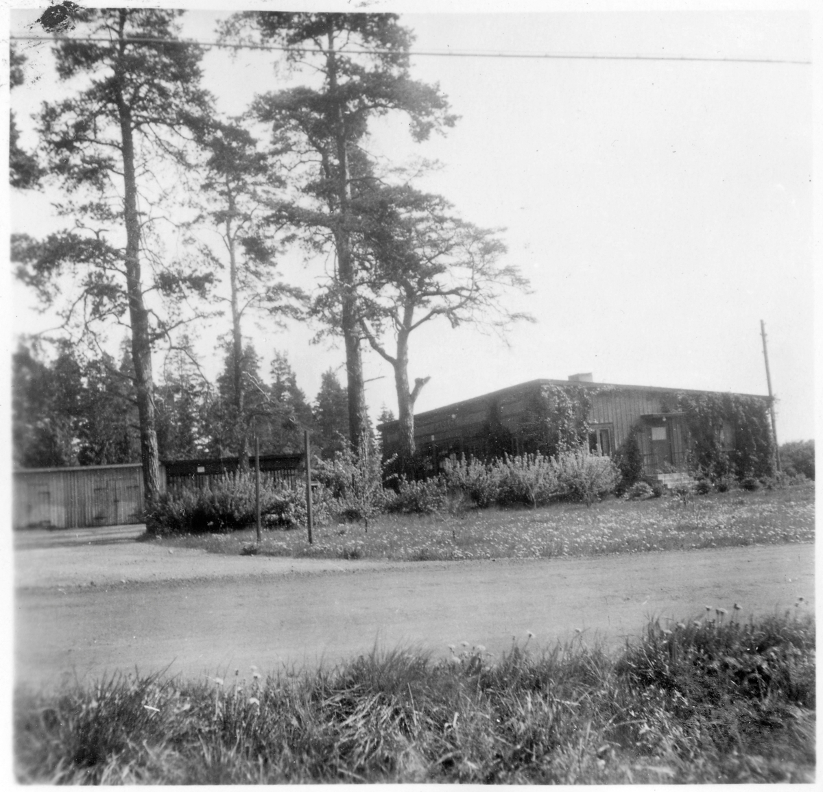 Vägstation T4, Svartå, filial Kvistbro. Garagebyggnad, eventuellt med tjänstebostad för vägmästaren i hitre gaveldelen. Förrådsbyggnader till vänster. Invid väg.