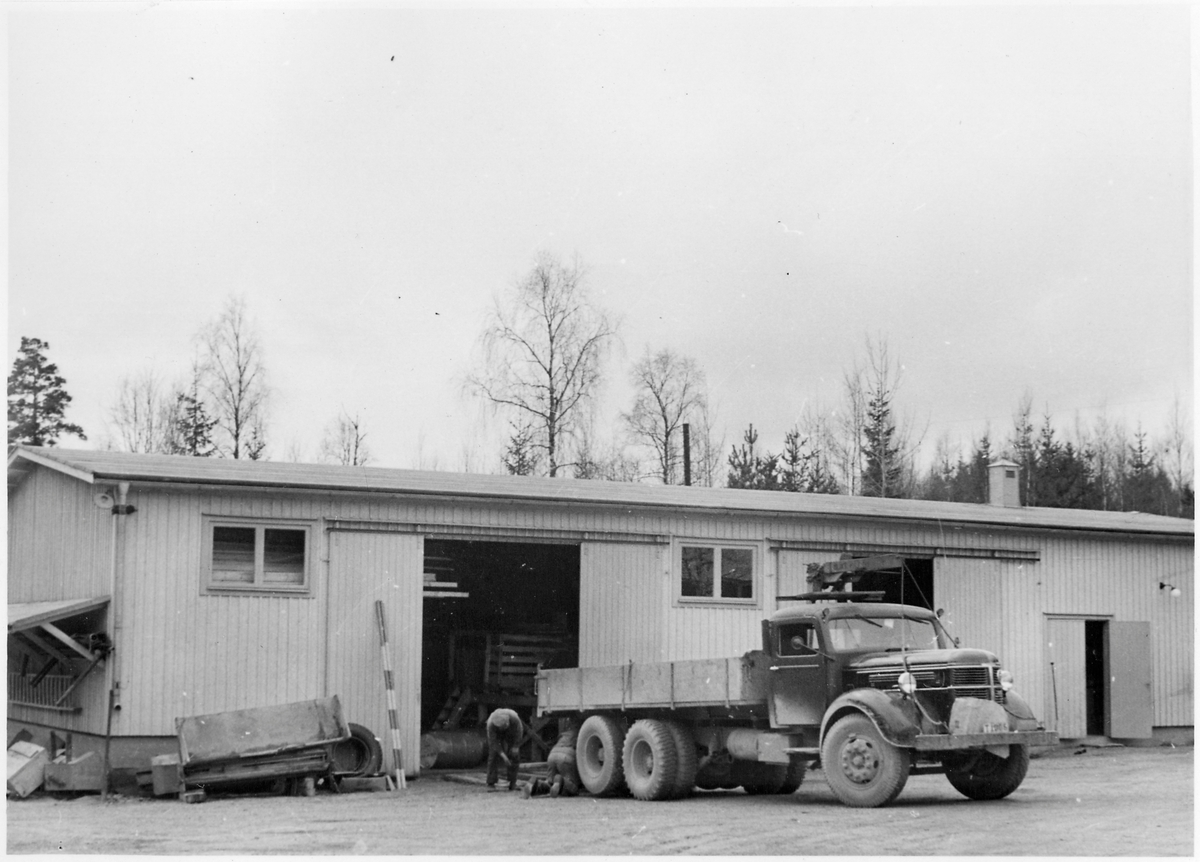 Vägstation T6, Nora. Förrådsbyggnad. Framför byggnaden en lastbil, Volvo, två män som håller på med ett arbete under bilen. Sandspridare till vänster.