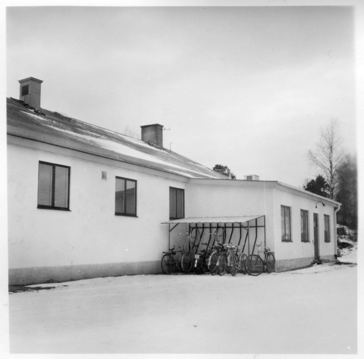 Vägstation U2, Uttersberg. Garage- och kontorsbyggnad. Baksidan med utbyggnad för kontor. Cykelställ med cyklar.