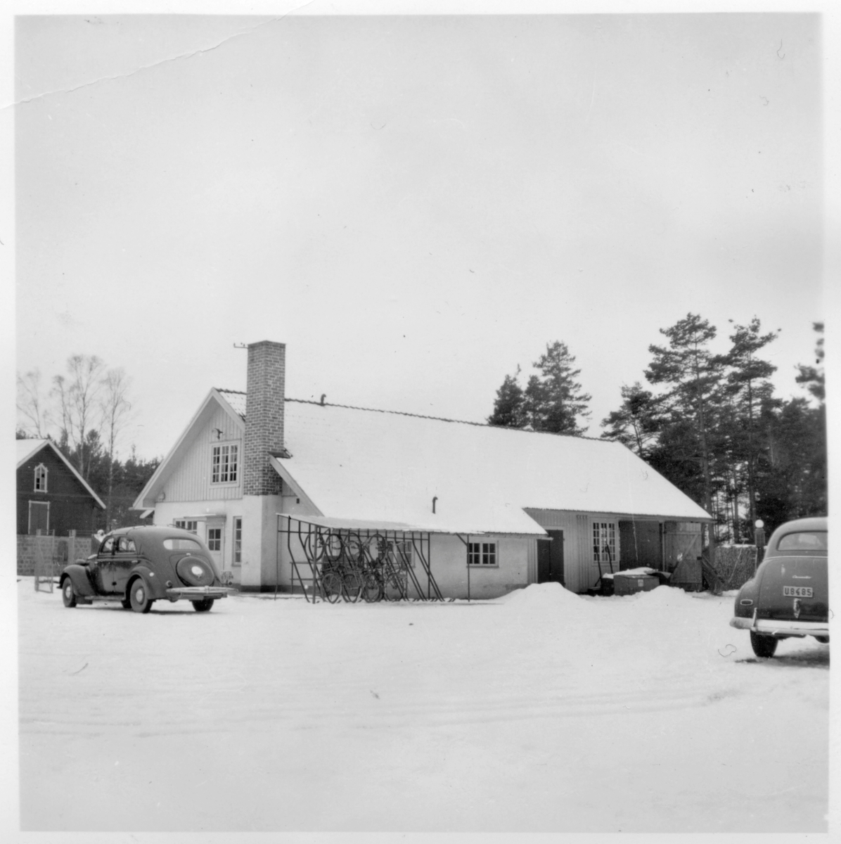 Vägstation U4, Salbohed. Garagebyggnad (baksidan). Verkstad och smedja till vänster. Cykelställ med cyklar, två personbilar, bland annat U8485. Förrådsbyggnad och bensinpump (drivmedelspump) i bakgrunden.