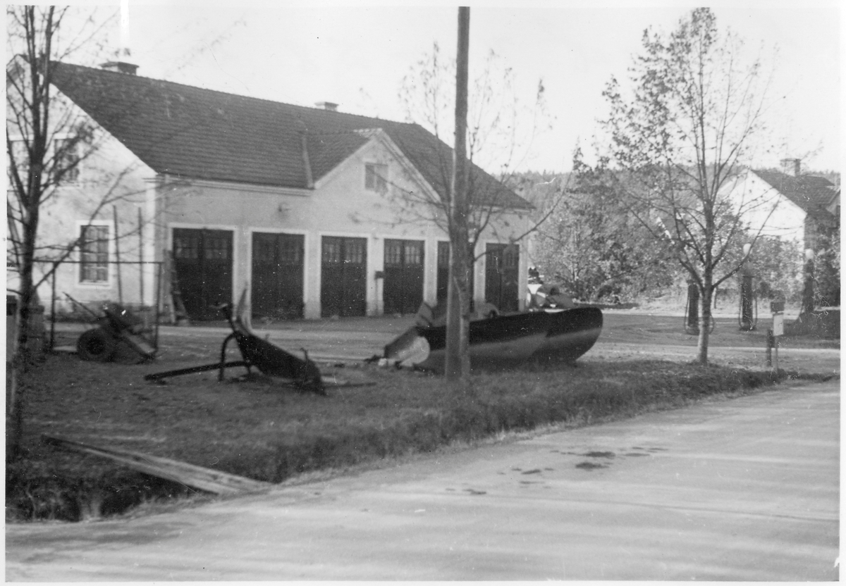 Vägstation S8, Deje. Garagebyggnad. Spetsplogar och sidoplog framför byggnaden. Bensinpumpar (drivmedelspumpar). Bostadshus i bakgrunden.