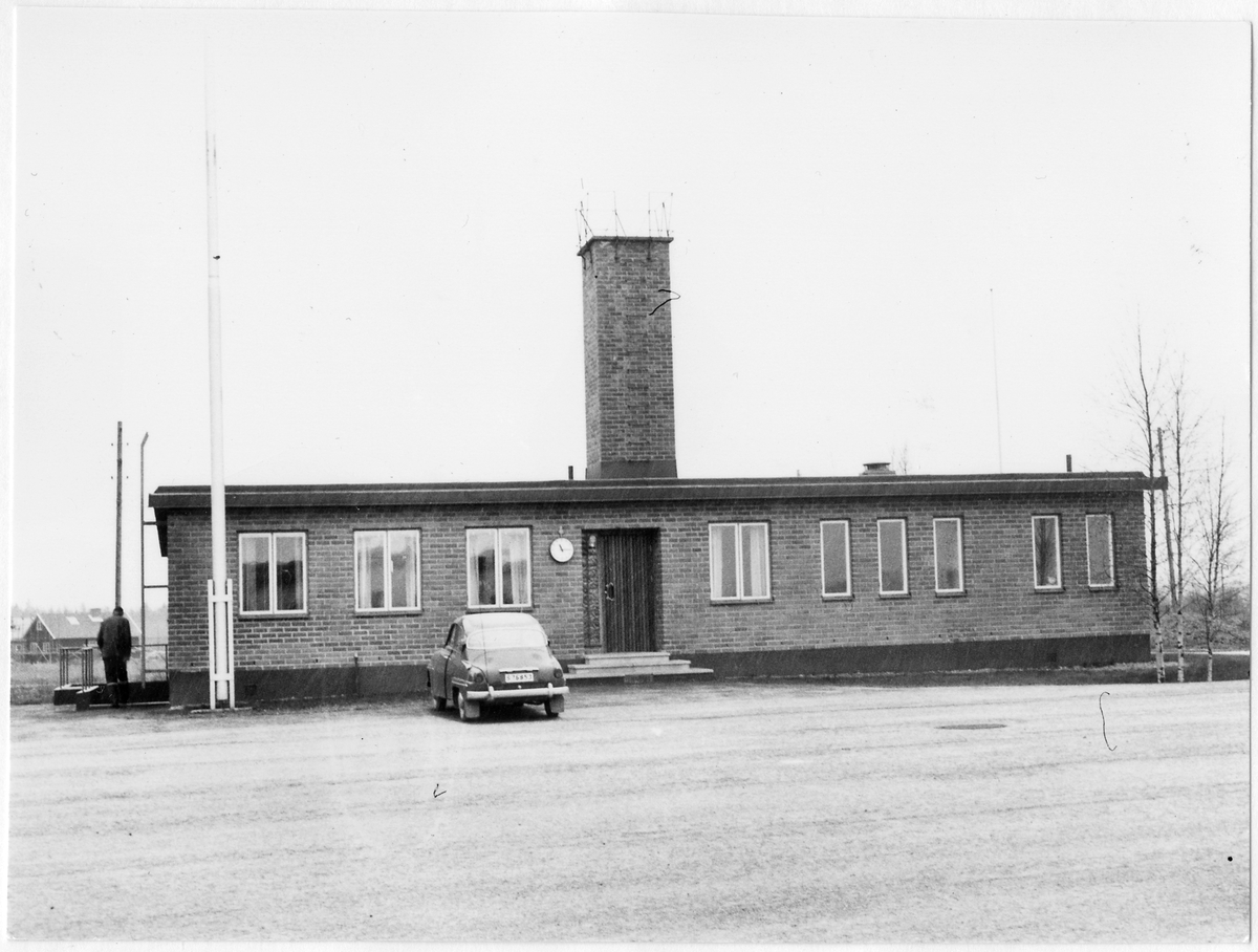 Vägstation S9 Kil. Kontorsbyggnad. Trappa till källarvåning. En mansperson på väg ner i källaren. Flaggstång vid gaveln. Personbil Saab framför byggnaden. Eventuellt Vägförvaltningen i Värmlands läns, VFS:s, depåverkstad.