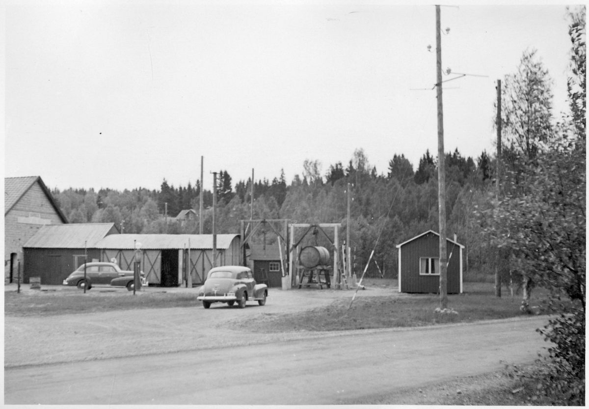 Vägstation S9 Kil. Garagebyggnad och förrådsbyggnader. Bensinpump (drivmedelspump), två personbilar. Luttunna till höger. Invid väg.