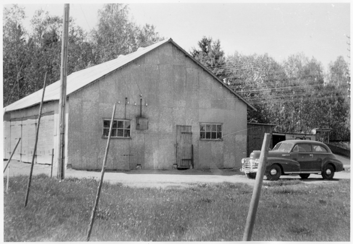 Vägstation S9 Kil, filial Edsvalla. Garagebyggnad av korrugerad plåt. Personbil framför byggnaden.