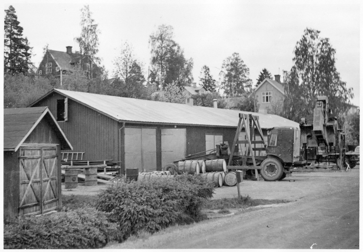 Vägstation S12, Åmotfors. Förrådsbyggnad. Framför byggnaden väghyvel, bortom denna en lastningselevator (skopelevator). Upplag av bränslefat. Bostadshus i bakgrunden. Invid väg.