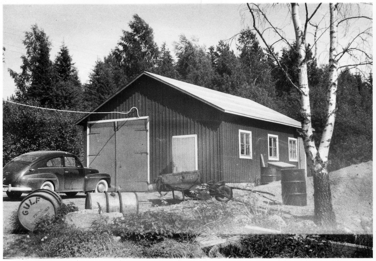 Vägstation S12, Åmotfors, filial Sulvik. Garage- och förrådsbyggnad. Sandspridare "Sprider", personbil Volvo PV framför garageporten, Bränslefat märkt "Gulf".
