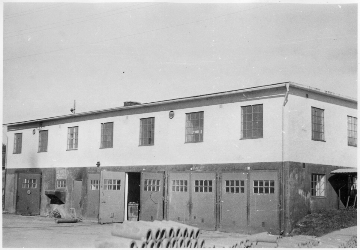Vägstation S13, Årjäng. Garagebyggnad. Garage i souterrängvåning och i markplanet. Upplag av cementrör.