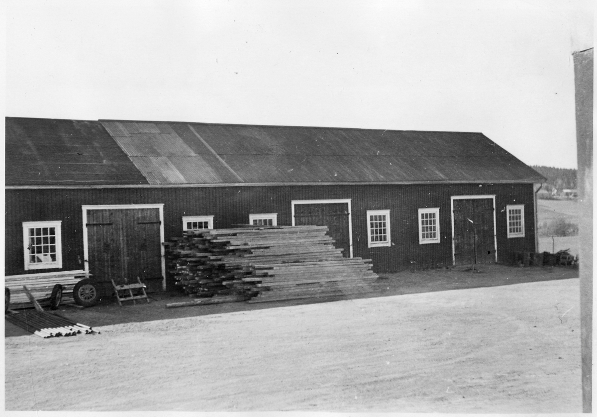 Vägstation S13, Årjäng. Förrådsbyggnad. Upplag av trävirke.