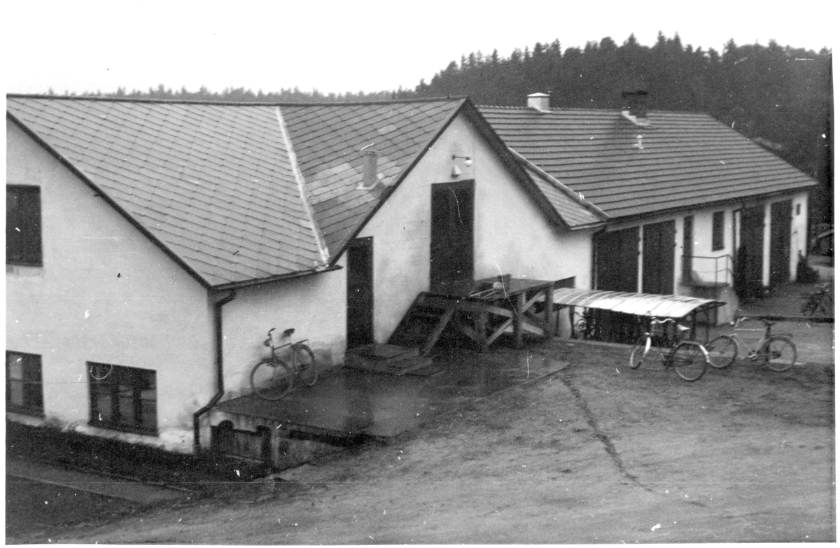 Vägstation P4, Tranemo. Vägstationens huvudbyggnad med förråd (framsidan). Cykelställ och cyklar.