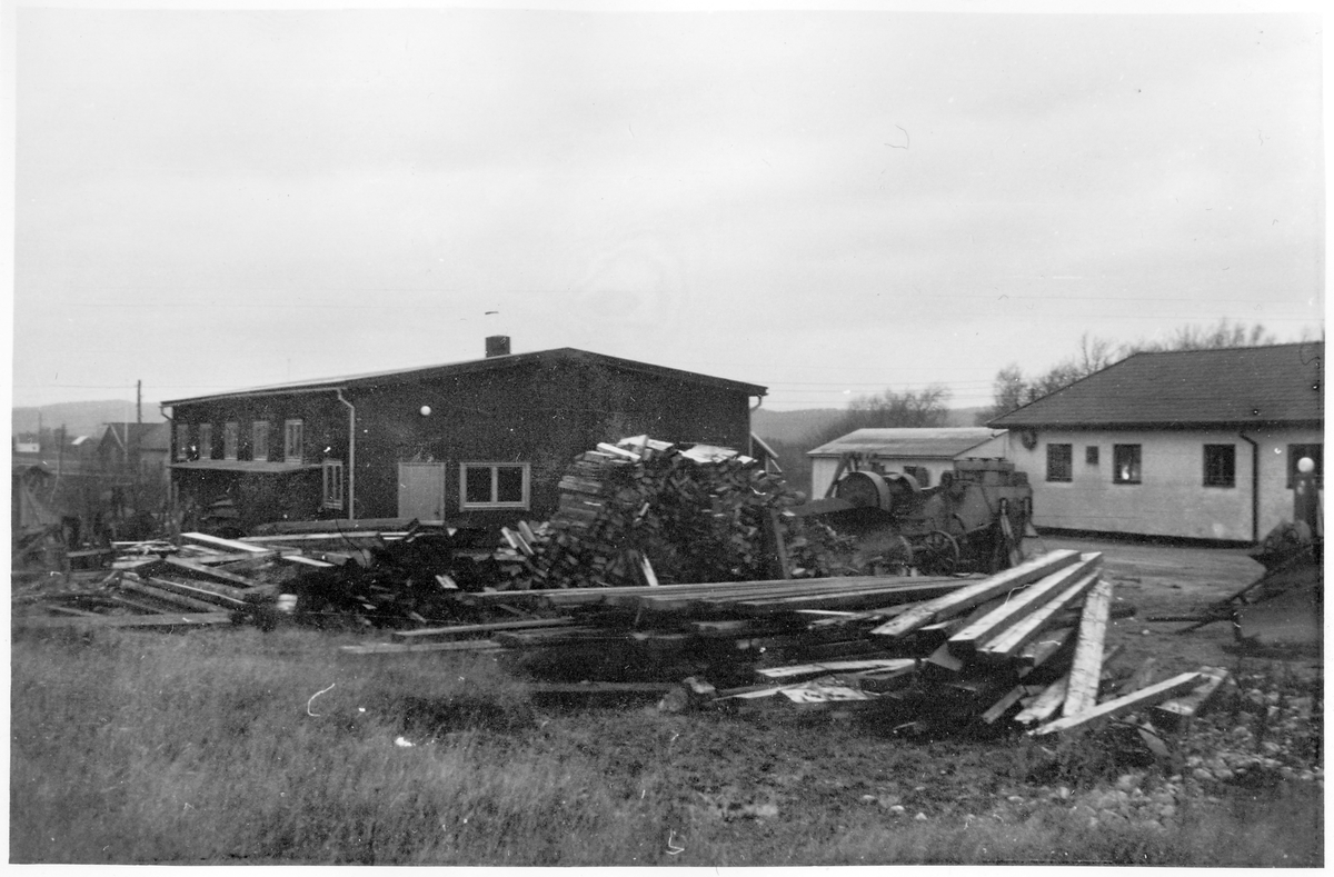 Vägstation P10, Torp. Baksidan av vägstationens huvudbyggnad (med verkstadsdelen), förrådsbyggnad. Upplag av virke. Stenkross, bensinpump (drivmedelspump).