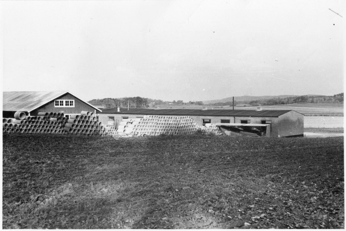 Vägstation N3, Kvibille. Garagebyggnad, till höger, förrådsbyggnad till vänster. Upplag av cementrör.