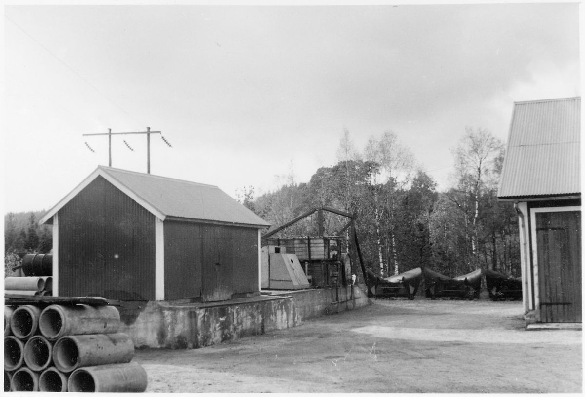 Vägstation N3, Kvibille, filial Torup. Förrådsbyggnad med lastbrygga. Luttunna, med lyftanordning för att lyfta upp den på lastbilsflak. Spetsplogar. Upplag av cementrör.