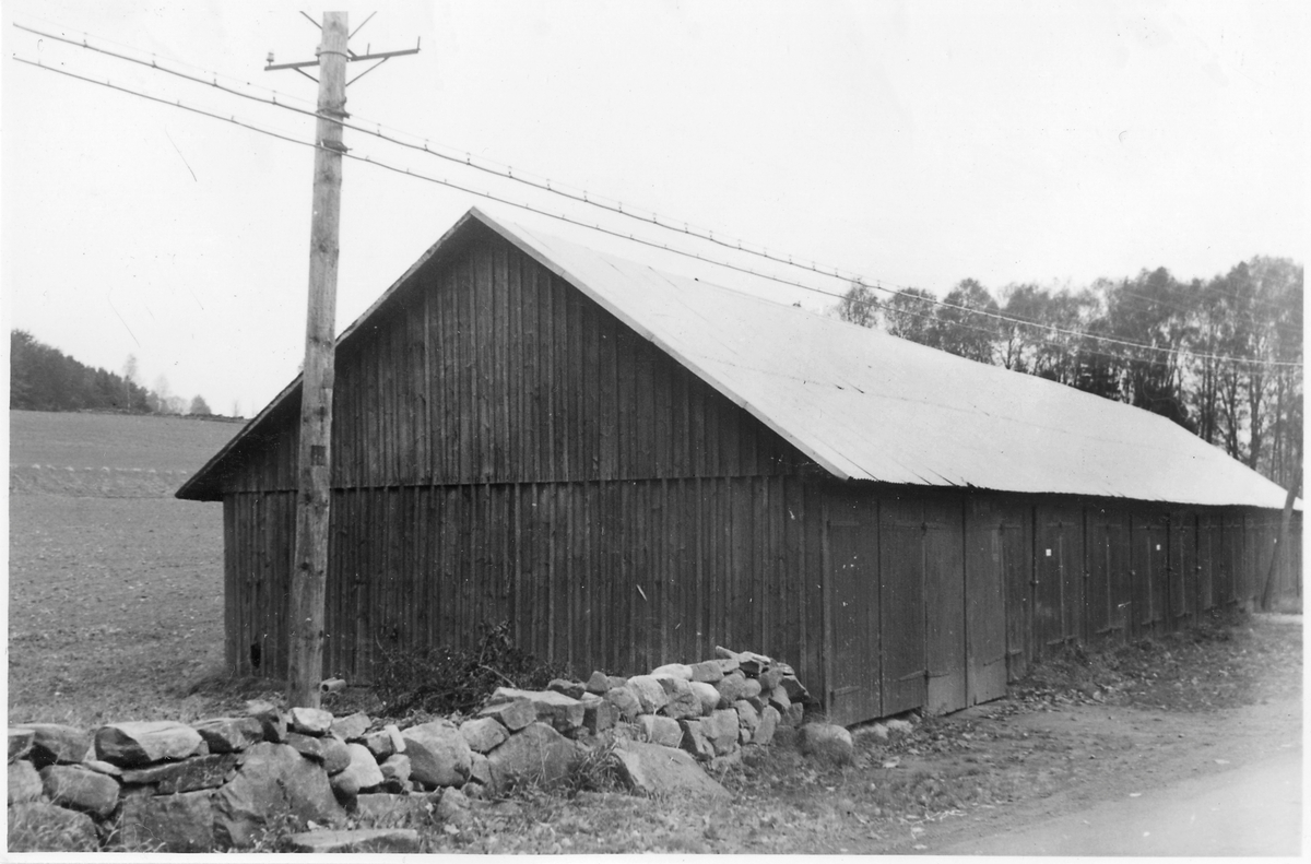 Vägstation N4, Vinberg, filial Ljungby. Garagebyggnad, invid väg med stenmur. Telefonstolpe.