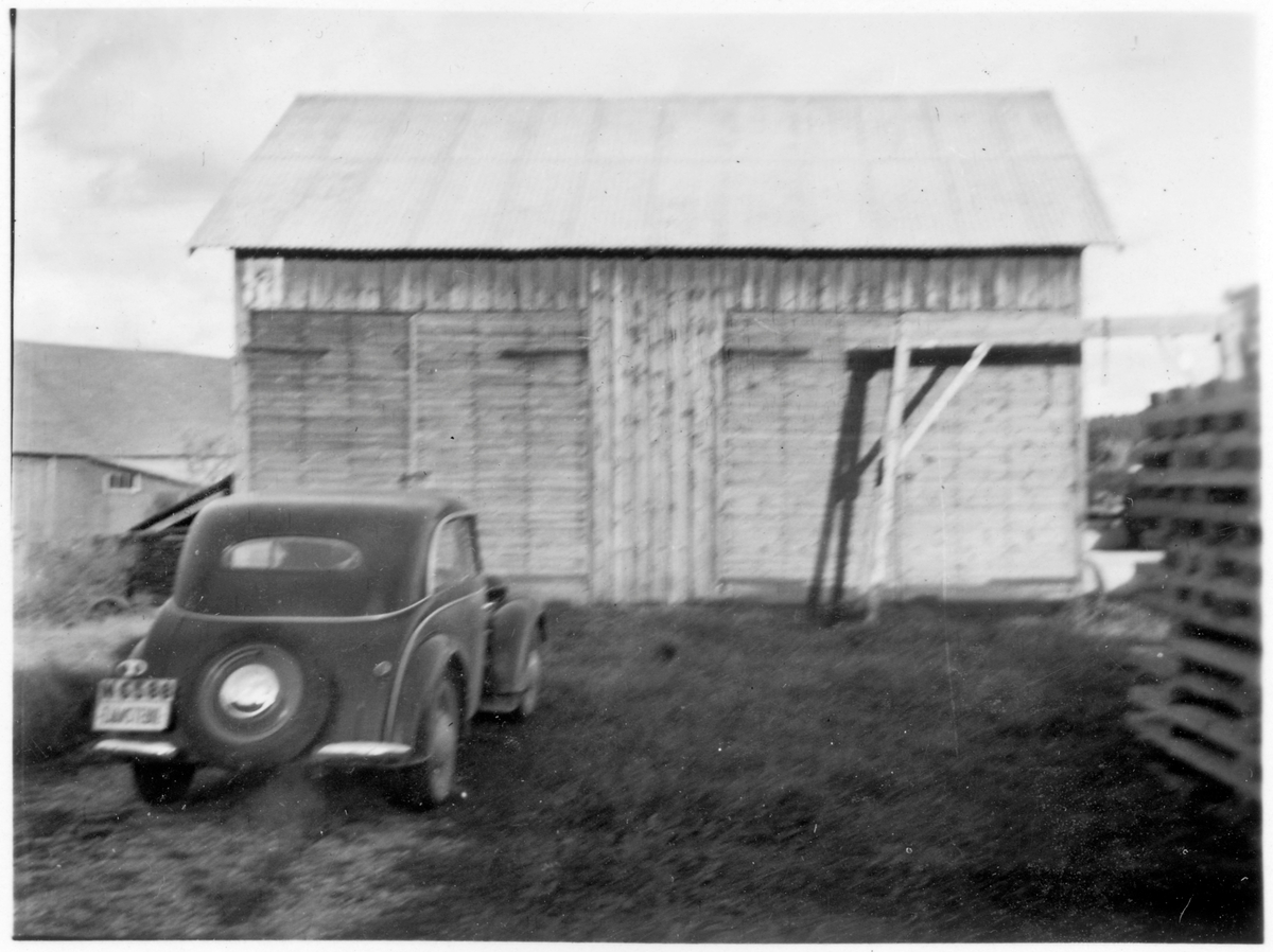 Vägstation N5, Ullared. Förrådsbyggnad. Personbil med skylten "Tjänstebil" parkerad framför byggnaden.