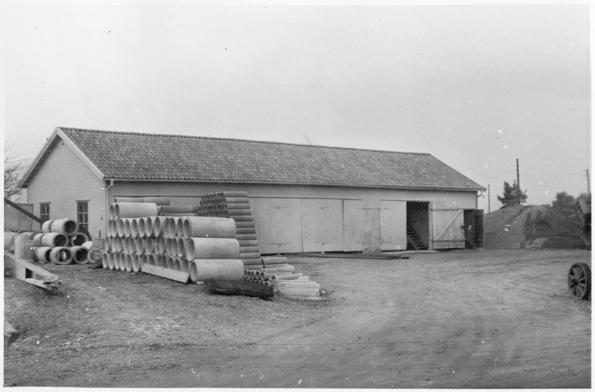 Vägstation N7, Kungsbacka. Förrådsbyggnad. Upplag av cementrör.