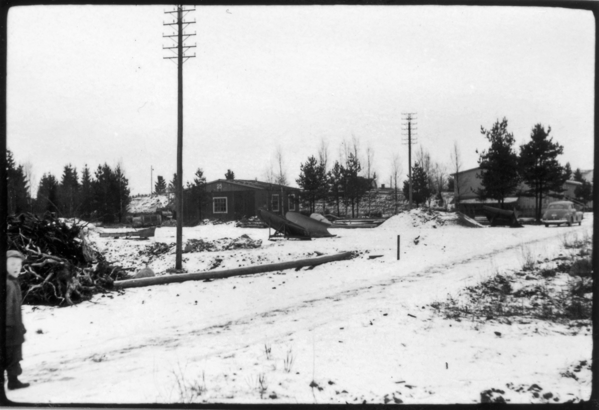 Vägstation F11, Sävsjö, filial Bodafors. Översikt av området med diverse byggnader. Spetsplog, sidoplog. Personbil på vägen. Pojke längst till vänster.