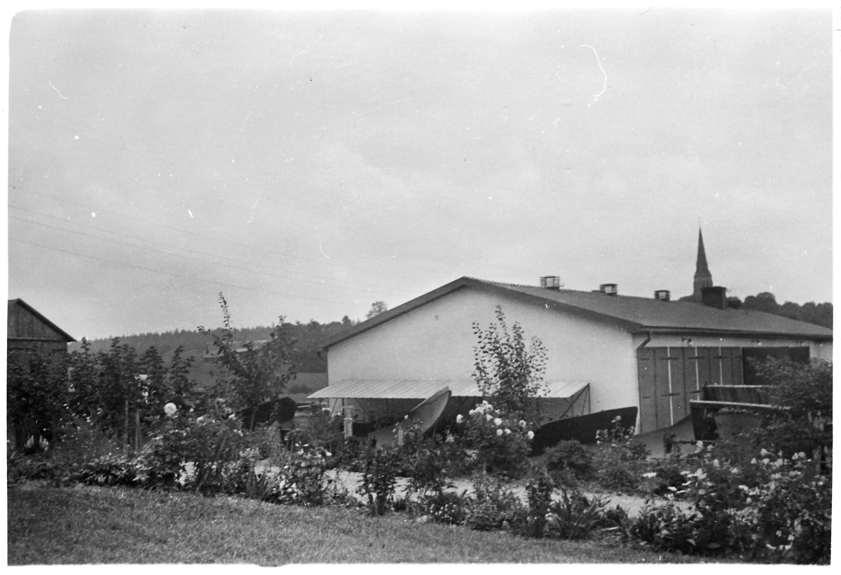 Vägstation R4 Undenäs. Vägstationens huvudbyggnad med garage, kontor och verkstad. Vid gaveln spetsplogar och sidoplogar. I bakgrunden spiran på Undenäs kyrka.