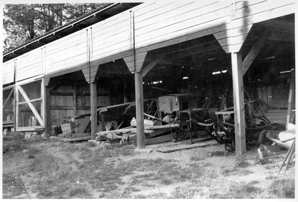 Vägstation R6, Ullervad. Förrådsbyggnad (öppet skjul) med olika väghållningsmaskiner och diverse "skrot", bland annat emulsionsspridare (för bitumen), fältässja.