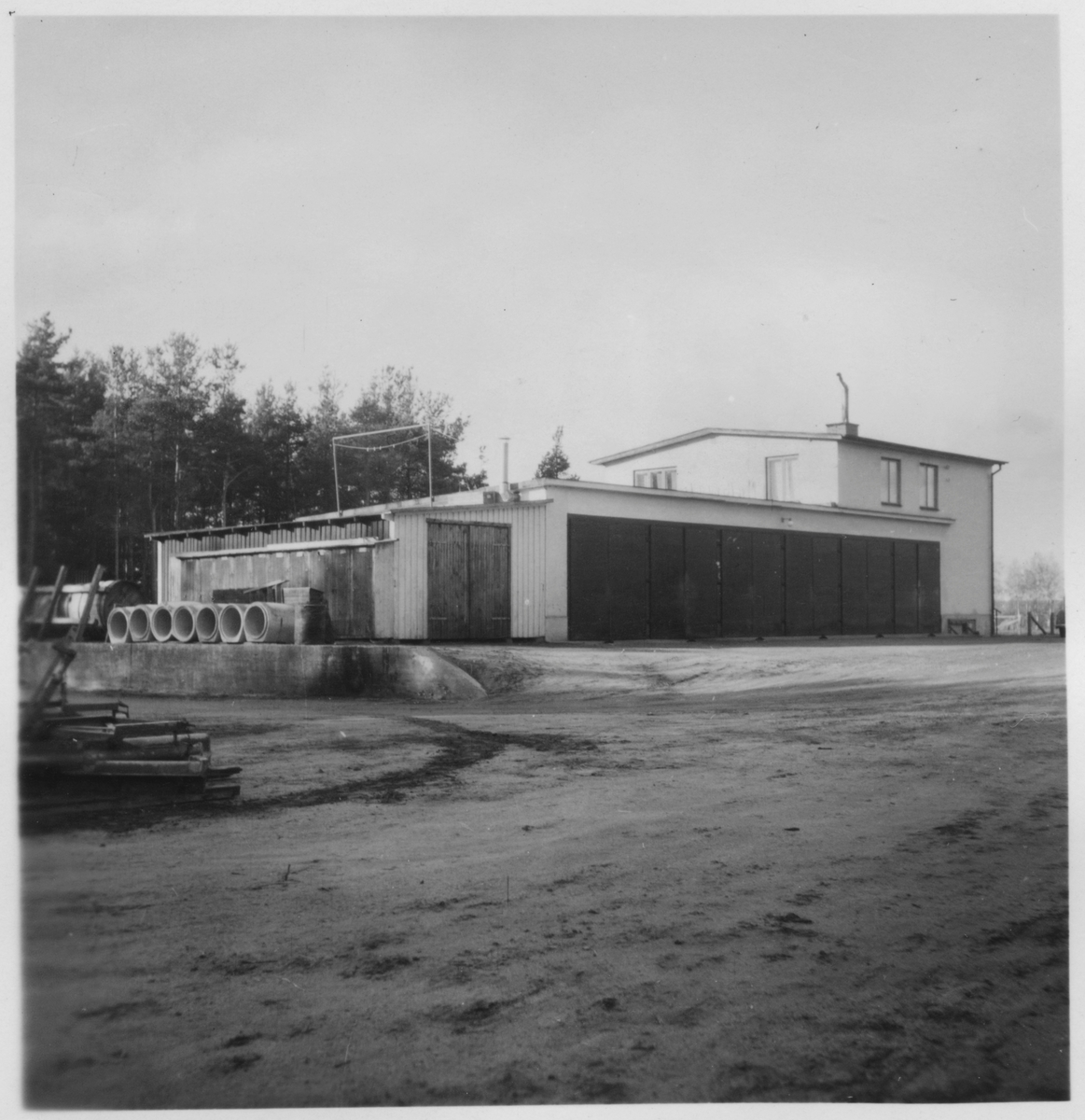 Vägstation R7, Götene. Vägstationens huvudbyggnad. Garagebyggnad (till vänster) hopbyggd med tvåvåningshus, eventuellt med bostad för vägmästaren i övervåningen, kontor i bottenvåningen. Förrådsbyggnad i anslutning till garaget. Cementrör upplagda på lastkaj. Vid förrådsbyggnaden manskapsskåp för manskapets personliga utrustning och redskap.