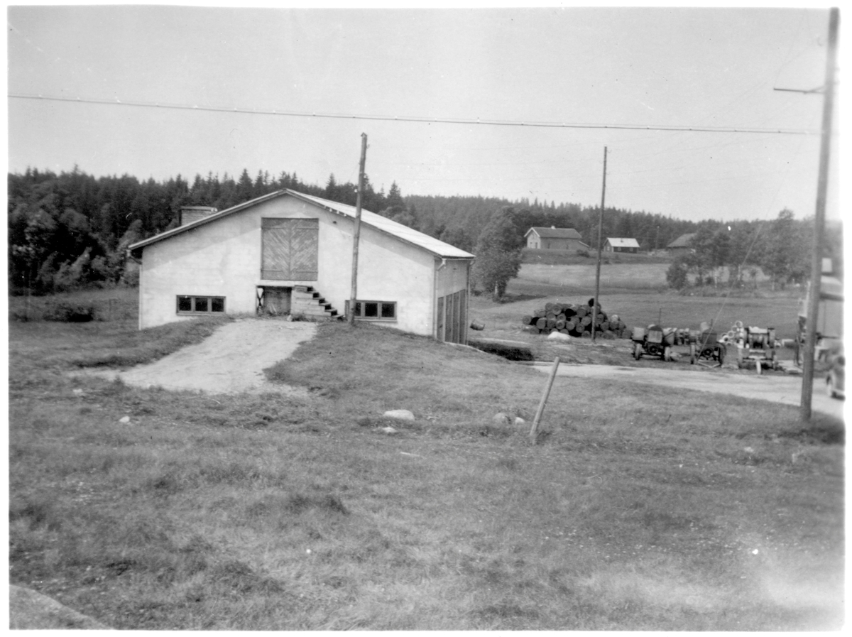 Vägstation P3, Svenljunga, filial Sexdrega. Garage- och förrådsbyggnad. Förråd i vindsvåningen med dörr på gaveln. Framför byggnaden stenkross, eventuellt en kompressor, upplag av bränslefat.