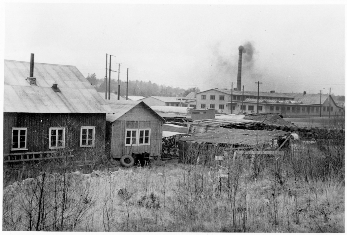 Vägstation P3, Svenljunga. Baksidan av vägstationens byggnader. Upplag av diverse material. Cykelställ med cyklar. I bakgrunden fabriksbyggnad med hög skorsten.
