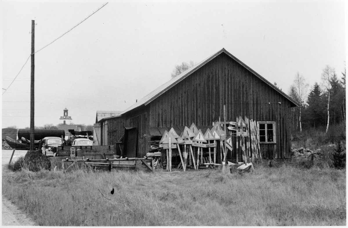Vägstation P3, Svenljunga. Kontors-, garage- och förrådsbyggnad. Vid gaveln upplag av vägmärken, bland annat vägmärke "Annan fara" med tilläggstavla "Vägarbete". Spetsplogar, två personbilar framför byggnaden. Invid väg. Svenljunga kyrka i bakgrunden.
