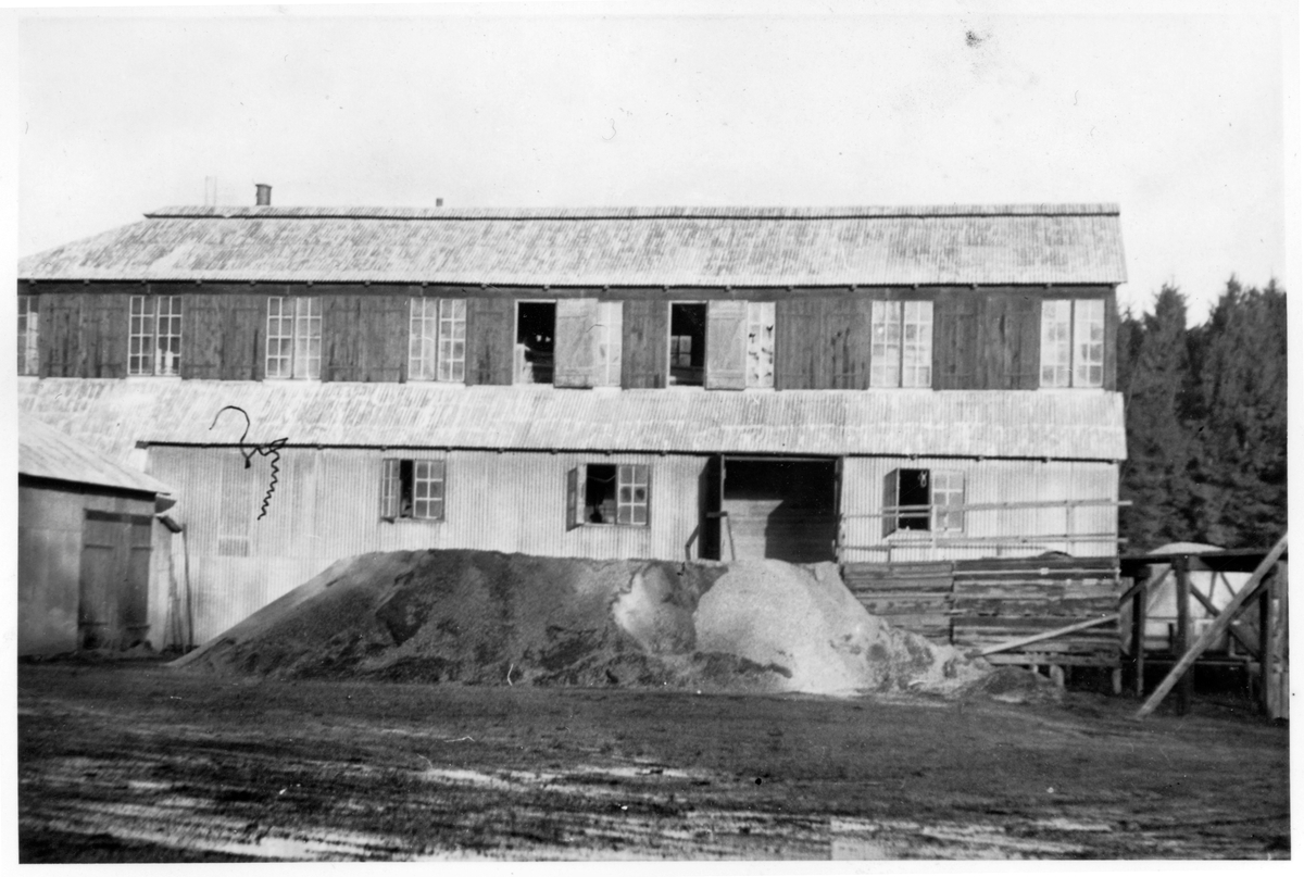 Vägstation L9, Hammenhög, filial Bollerup. Någon form av förrådsbyggnad i två våningar. Grushögar framför byggnaden.