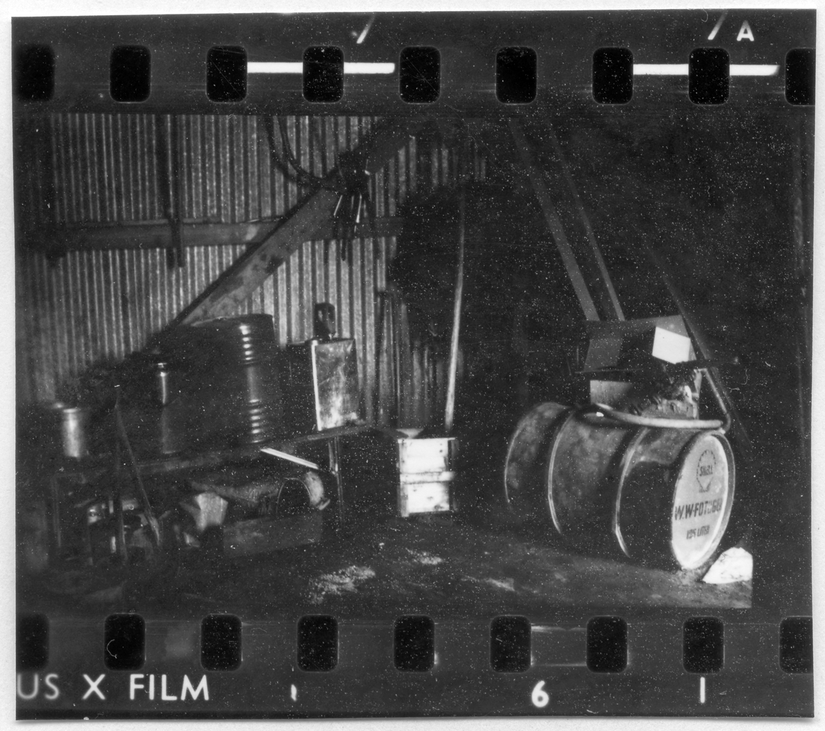 Vägstation Vmo B1, Östhammar. Filial Valö. Interiör av kallförrådet. Bränslefat och diverse övriga burkar och fat.