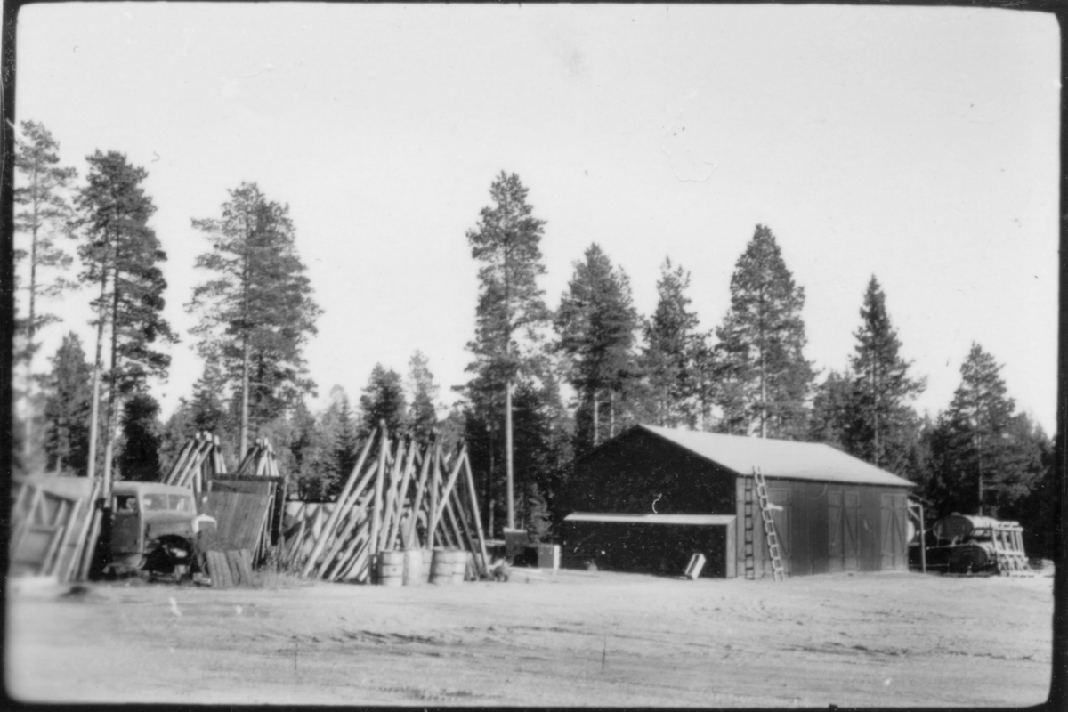 Vägstation AC6, Robertsfors. Förrådsbyggnad. På gaveln manskapsskåp för manskapets personliga utrustning och redskap. Lastbil (defekt), luttunnor, sten- och stubbrytare, bränslefat.