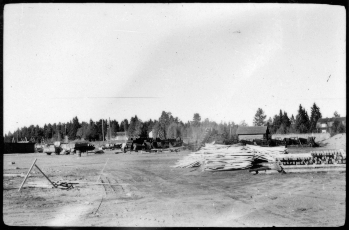 Vägstation AC7, Lövånger. Garageplan med uppställning av olika väghållningsmaskiner, bland annat spetsplogar, sidoplogar, skopelevator (lastningselevator), luttunnor, sand- och gruskärra. Upplag av bränslefat och trävirke.