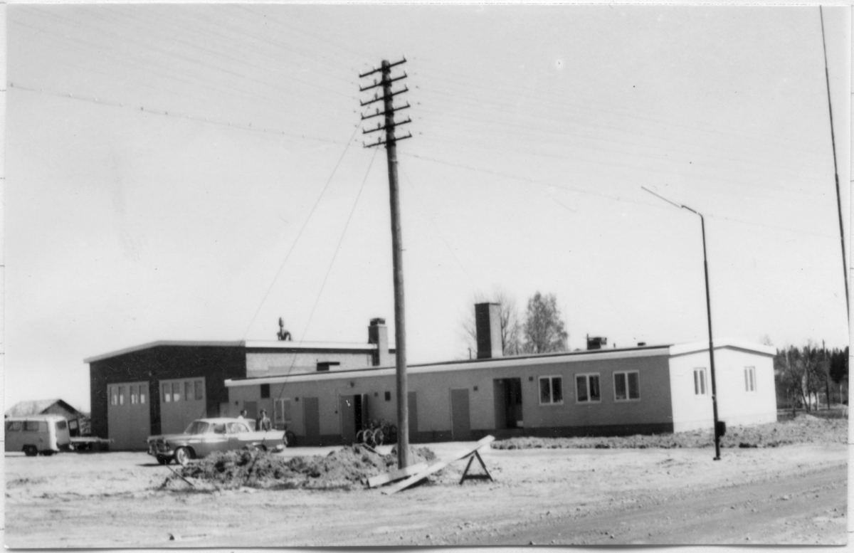 Vägstation AC7, Lövånger. Vägstationens huvudbyggnad med verkstad, förråd och kontor. Viss markberedning av garageplan pågår. Personbilar, cyklar. Belysningsmast, telefonstolpe.