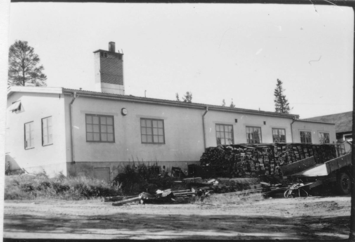 Vägstation AC8, Burträsk. Vägstationens huvudbyggnad med garage, kontor och förråd (baksidan). Släpkärra till lastbil. Upplag av ved.