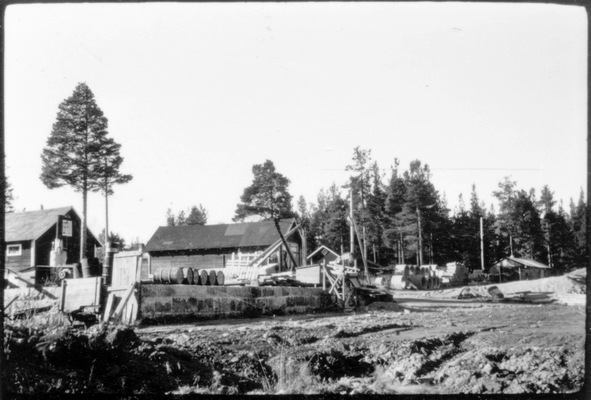 Vägstation AC8, Burträsk. Vy över vägstationens område med förrådsbyggnader. Upplag av diverse materiel, bland annat cementrör. Lastkaj med bränslefat.