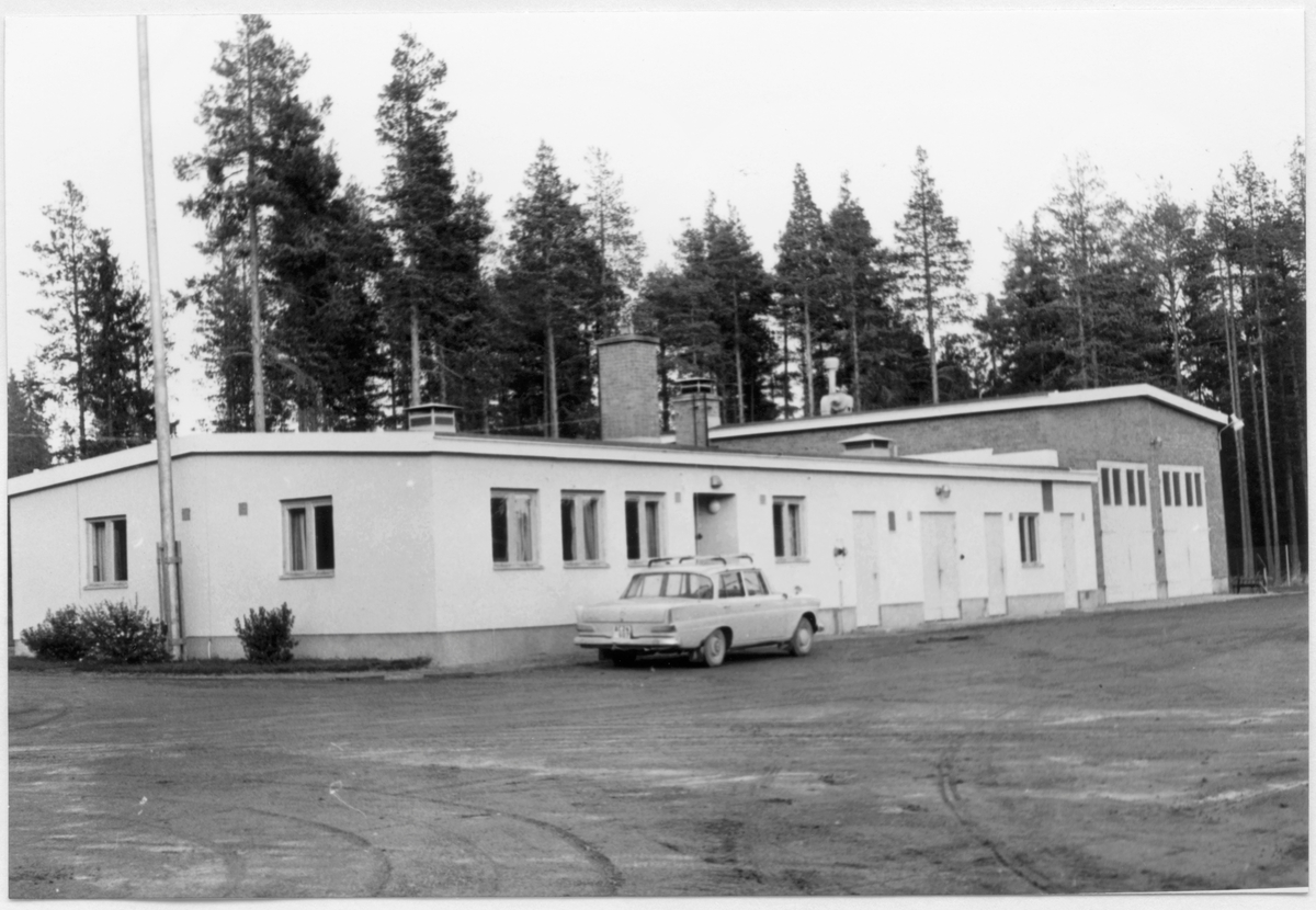 Vägstation AC8, Burträsk. Vägstationens huvudbyggnad med kontor, förråd och verkstad. Radiokommunikationsmast vid gaveln. Personbil Mercedes framför kontoret.