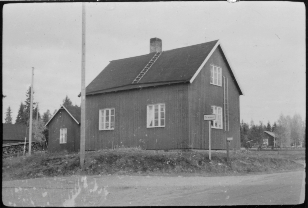 Vägstation AC9, Skellefteå, färjvaktarbostad Örviken. Bostadshus för färjvaktaren. Förrådsbyggnad till vänster. Invid väg med ortnamnsmärke (ortnamnskylt) "Örviken".