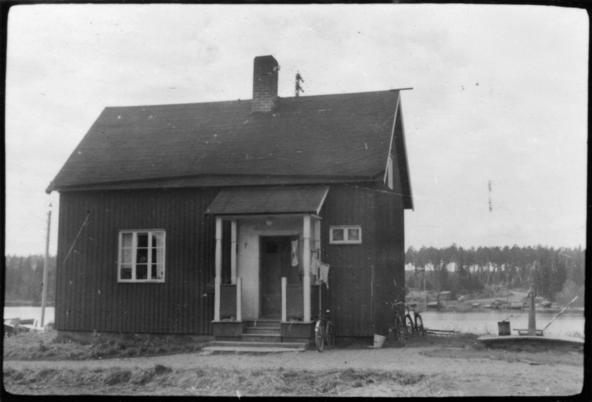 Vägstation AC9, Skellefteå, färjvaktarbostad Örviken. Bostadshus för färjvaktaren. Cyklar vid huset. Vattenbrunn. Färjleden och färjeläge skymtar i bakgrunden.