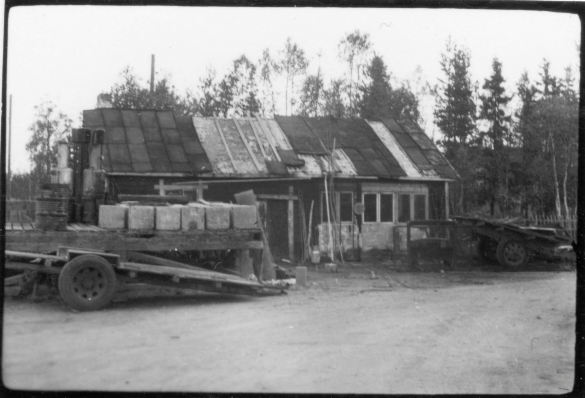 Vägstation AC11, Jörn. Byggnad, eventuellt gammal smedja. Upplag av diverse materiel utanför, "skrot". Släpkärra till lastbil.