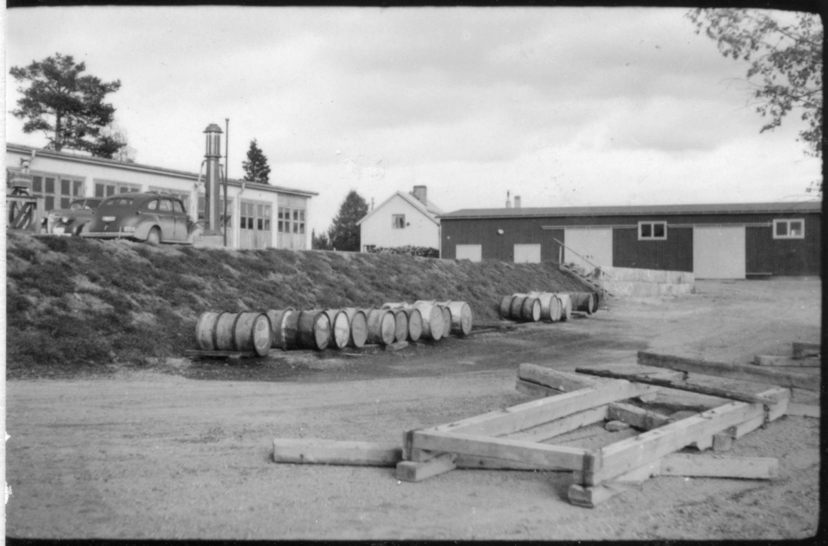 Vägstation AC12, Norsjö. Vägstationens huvudbyggnad med verkstad, kontor och garage. Till höger förrådsbyggnad. Bostadshus i bakgrunden, eventuellt tjänstebostad för vägmästaren. På garageplan bensinpump (drivmedelspump) Ljungmans, modell Vici, personbilar, cykelställ med cykel. Upplag av bränslefat.