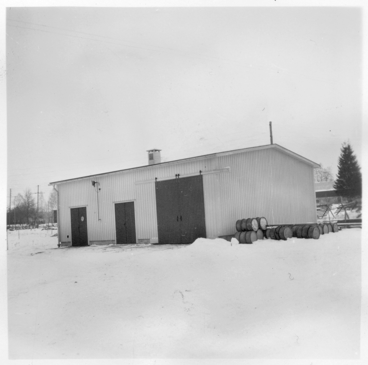 Vägstation U4, Salbohed, filial Möklinta. Förrådsbyggnad. Upplag av bränslefat vid gaveln.