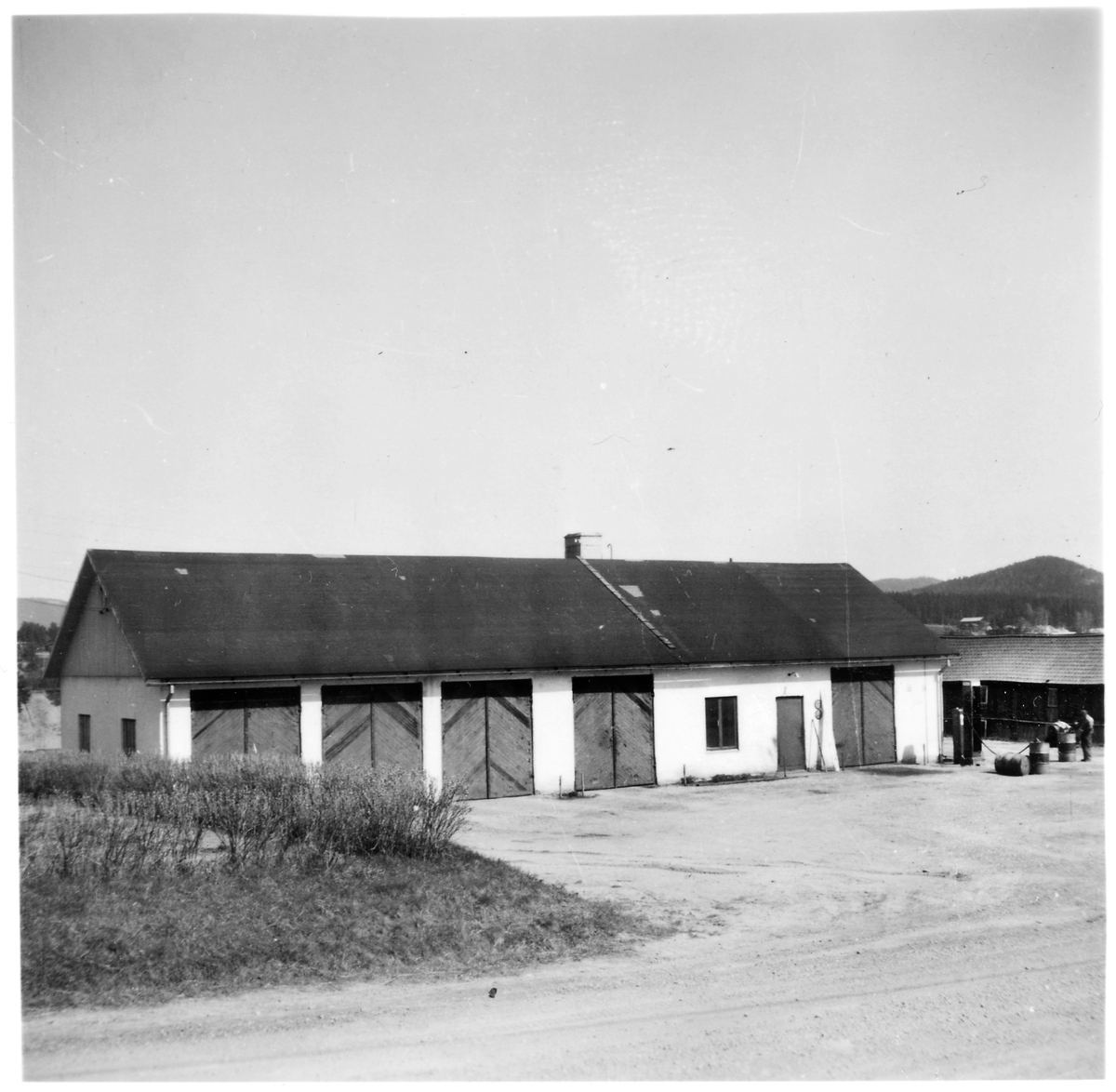 Vägstation Y2, Torpshammar. Garagebyggnad. Till höger bensinpumpar (drivmedelspumpar). Mansperson som fyller på drivmedel i bränslefat.