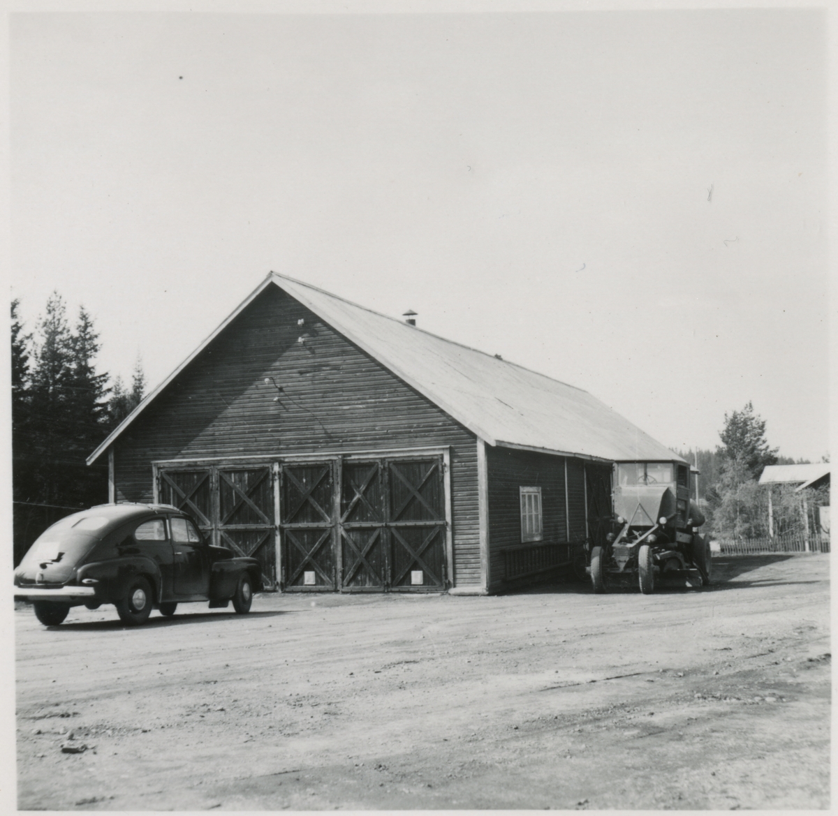 Vägstation Y5, Stavreviken, filial Filland. Garagebyggnad med portar på gaveln. Till höger väghyvel. Personbil Volvo PV framför garageportarna.