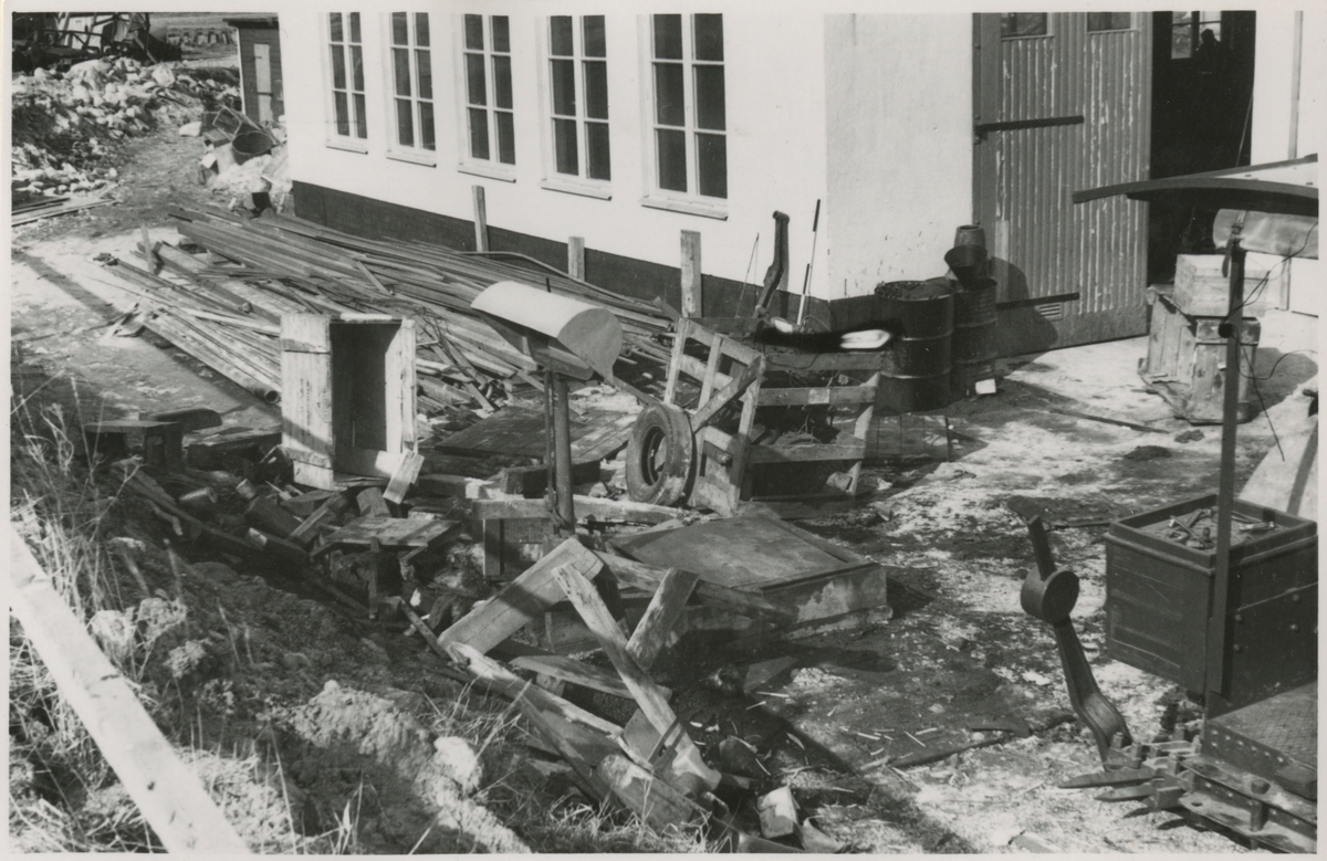 Vägstation Y6, Älandsbro. Baksidan av garagebyggnaden. Diverse material, "skrot". Till höger skymtar en motorvält, Munktell. Eventuellt depåverkstadens (länsverkstadens) material.