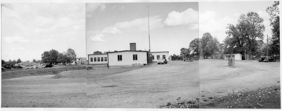 Vägstation R13, Skövde, Skultorp. Panoramabild över vägstationen. Garagebyggnad med bakomliggande depåverkstad. Vy från väster. Till höger bensinpump (drivmedelspump). Bakom garagebyggnaden spetsplogar och sidoplogar. Personbilar parkerade på garageplan. Liten lastbil (paketbil) framför garaget. Radiomast på byggnaden. Infart till området från höger.