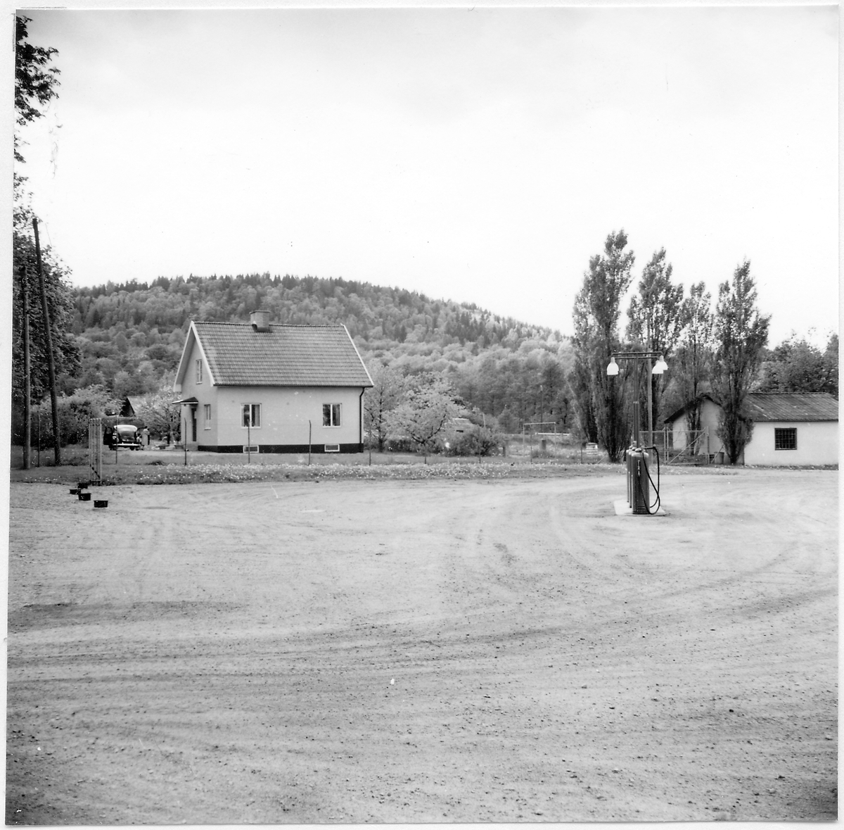 Vägstation R13, Skövde, Skultorp. Vägmästarens tjänstebostad, utanför de inhägnade vägstationsområdet. Bensinpump (drivmedelspump) i förgrunden. Personbil framför bostadshuset.