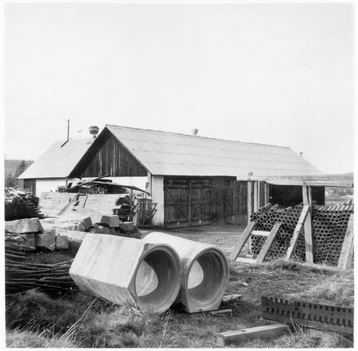 Vägstation Y6, Älandsbro, filial Lägdom. Garage- och förrådsbyggnad. Upplag av bland annat cementrör, täckningsrör, stenstolpar. Hyvelstål i förgrunden till höger.