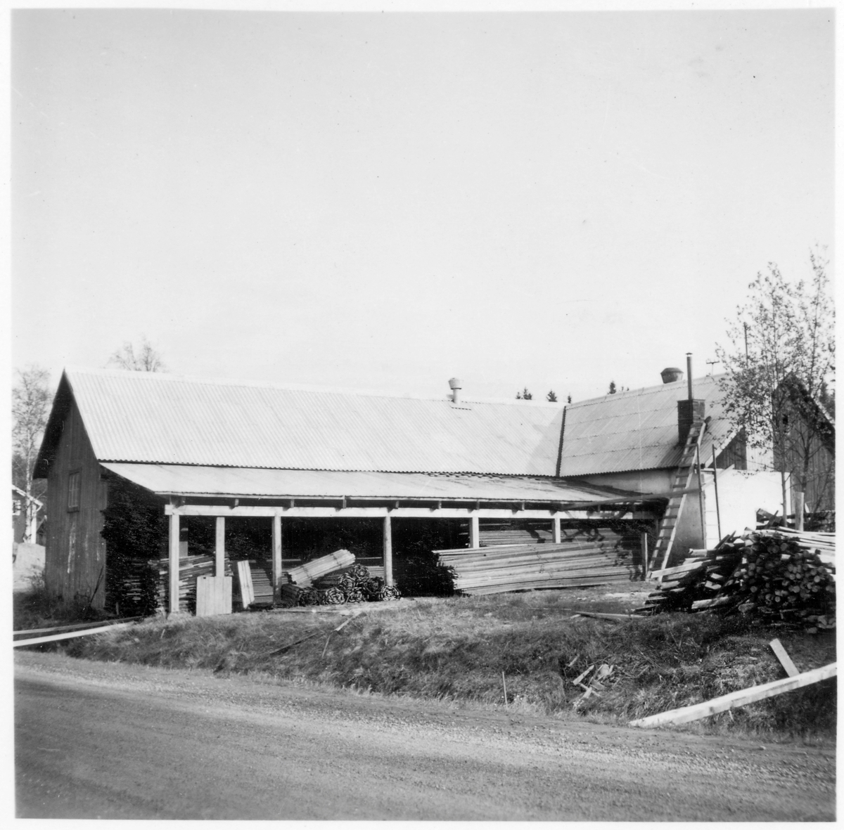 Vägstation Y6, Älandsbro, filial Lägdom. Garage- och förrådsbyggnad (baksidan). Upplag av bland annat snöskärmar (hoprullade). Invid väg.