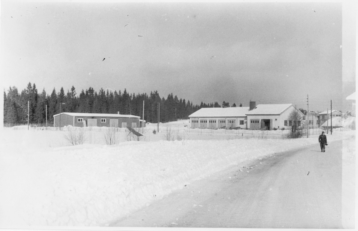 Vägstation Y8, Bjästa. Vy mot vägstationens huvudbyggnad med från vänster garage, kontor, verkstad. Förrådsbyggnad till vänster. Spetsplogar och sidoplogar framför byggnaden. Invid väg (vinterbild).